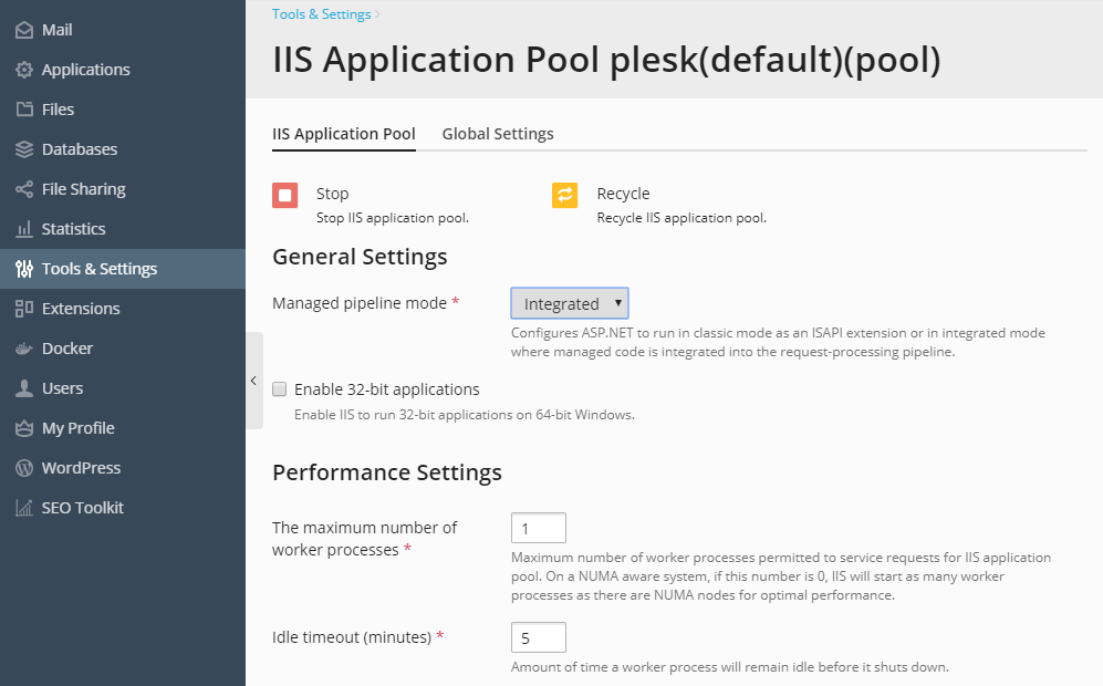 By default, Plesk offers a shared application pool for all users. However, users can use dedicated application pools if this option is provided by the hosting package.