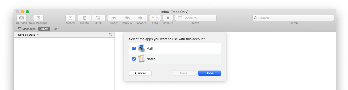 Once the settings are verified, choose what apps you want to use with the mail account and then click Done.