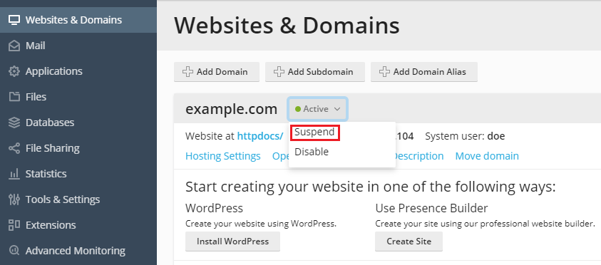 Plesk supports three website statuses: Suspended, Disabled, and Active.